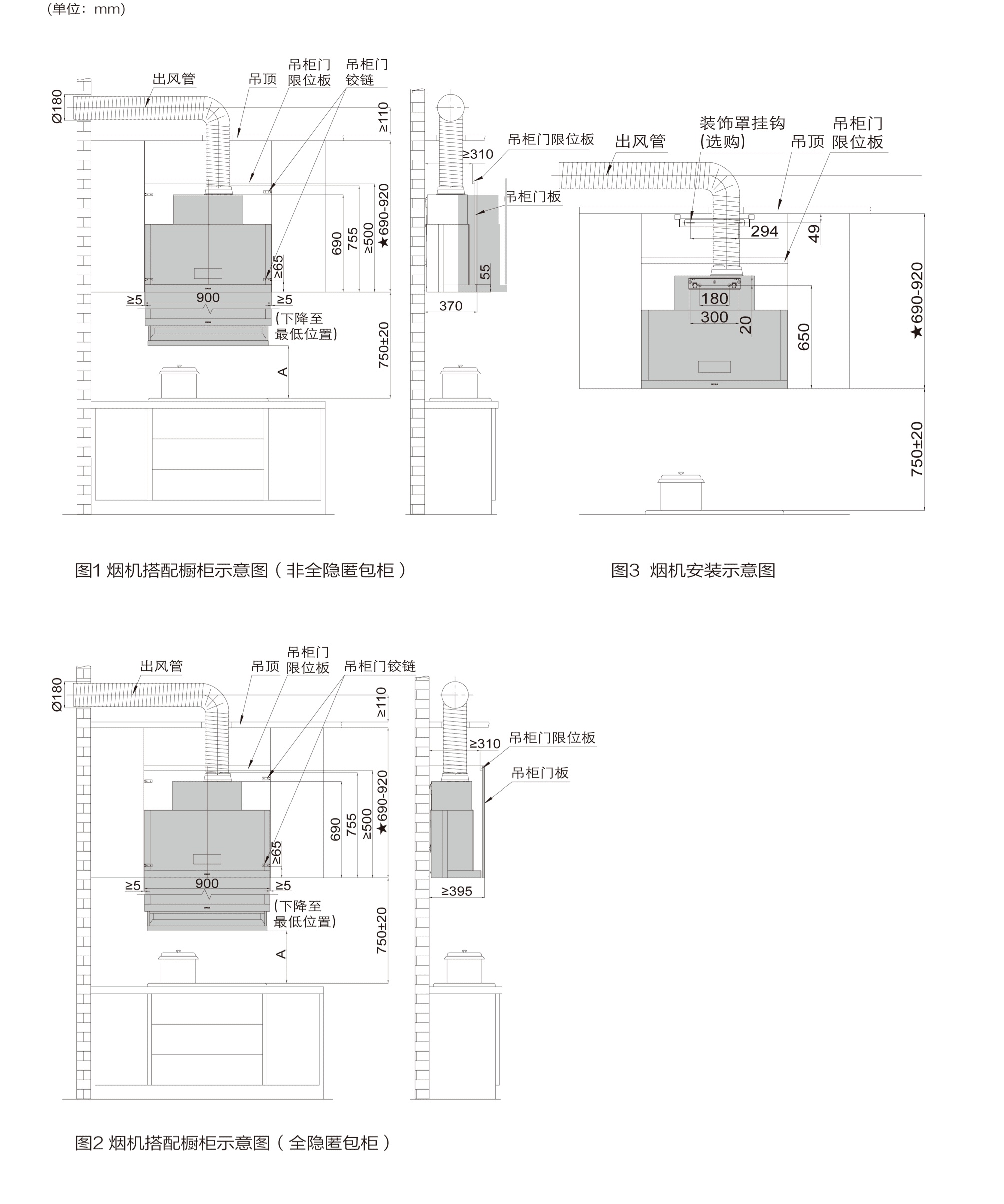 2.吊柜内部高度尺寸需≥750mm。搭配示意图中★690-920为含装饰罩高度尺寸范围,装饰罩及装饰罩挂钩组件为选购件;