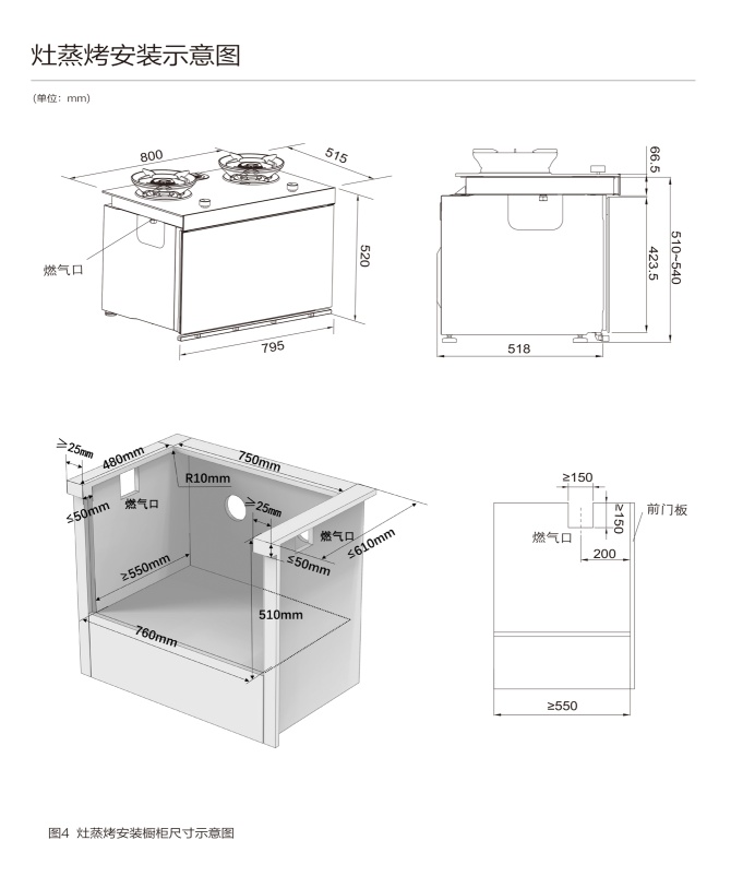 3、台面开孔和橱柜开孔的左右中心须对齐,且台面上沿到承重固板距离510(0,+5)mm。