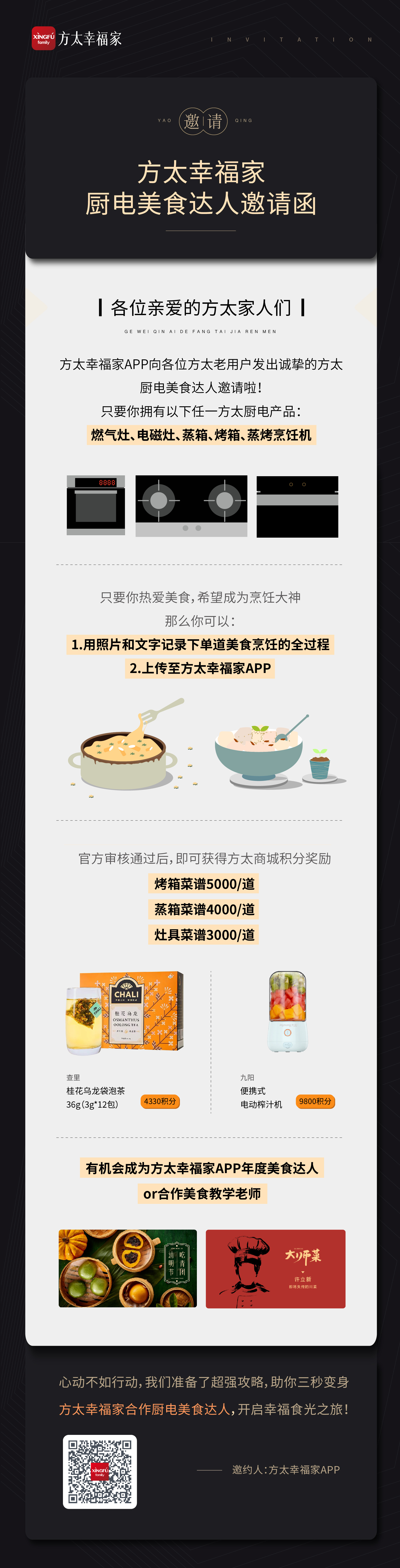 现在方太幸福家向所有方太家人们发出诚挚的厨电美食达人邀请函啦,诚邀大家在方太幸福家与我们分享自己一日三餐的幸福食光。