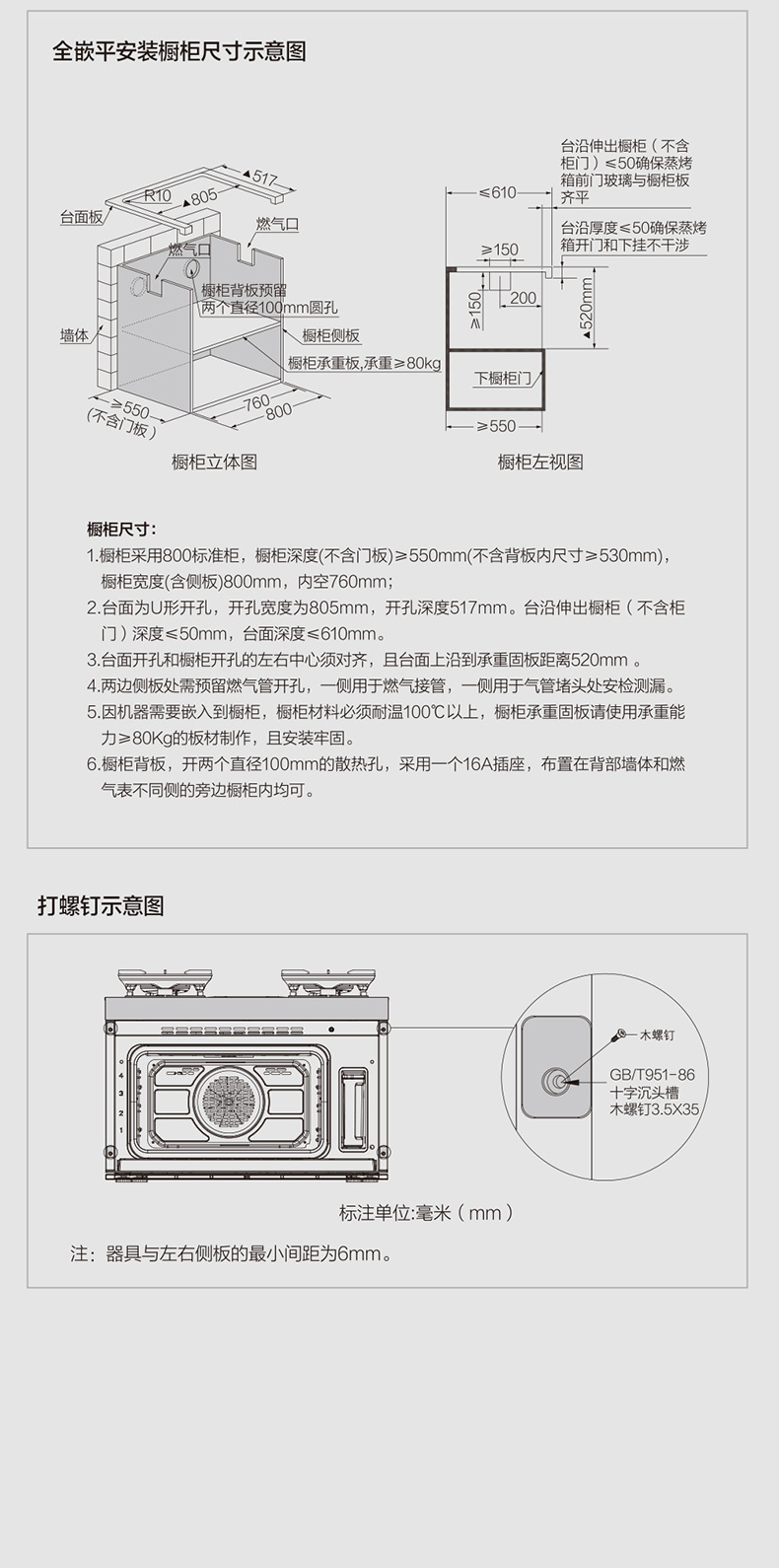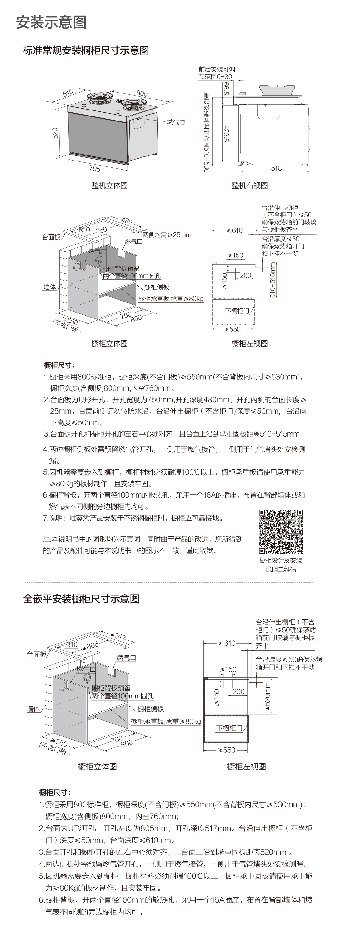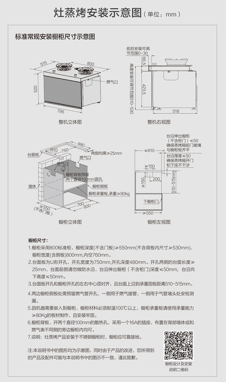 一体式:长(左右)800*宽(前后)568(箱体518+门体厚度20+前后宽度最大可调节30)*高(上下)520mm(部分资料高度标注600mm,是锅支架到底部的距离,请知晓)
