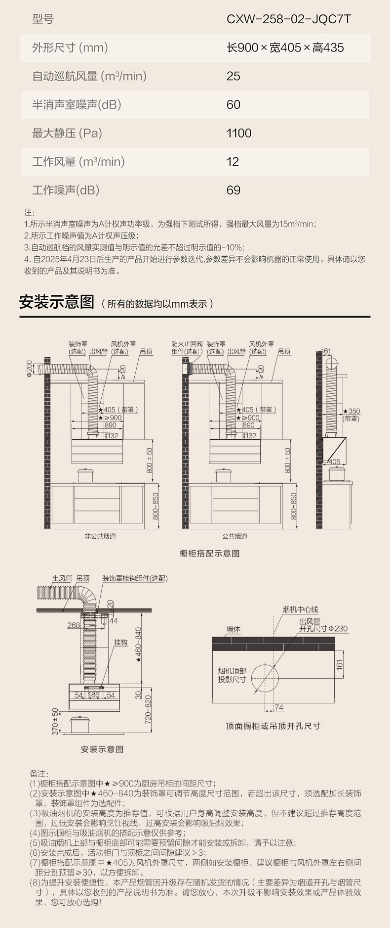1. 所示噪声(半消声室噪声)值为A计权声功率级,所示工作噪声值为A计权声压级。 2. 强档最大风量为15m³/min,噪声(半消声室噪声)为强档测试下所得。 3. 自动巡航档的风量实测值与明示值的允差不超过明示值的-10%,对应半消声室测试噪声符合所引用的标准限值要求。