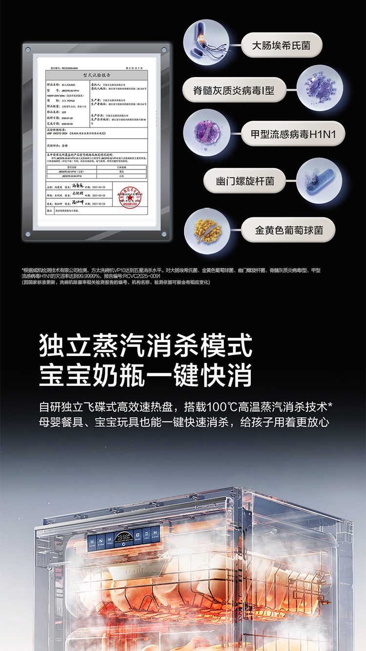 设备端:保洁存储、蒸汽除菌、下层速洗;方太幸福家APP端:加强烘干、加强漂洗