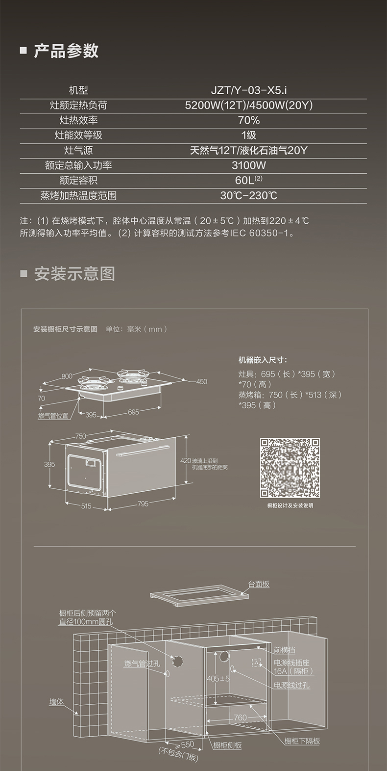 分体:灶具:长(左右)800*宽(前后)450*高(上下)70mm(灶具面板上沿至底盘下沿)/蒸烤箱:长(左右)795*宽(前后)515*高395(箱体上下)mm(玻璃上沿到机器底部距离420mm)