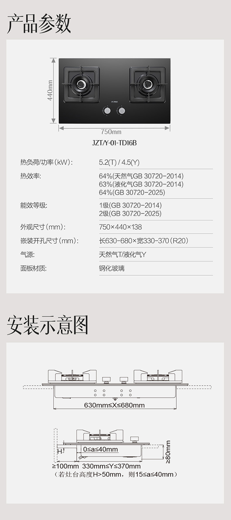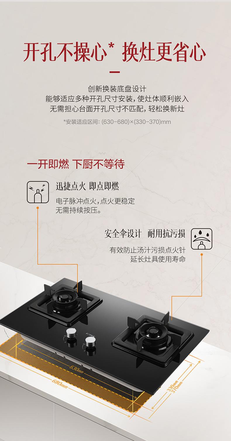 全新安装时,建议开孔长(左右)630*宽(前后)330 R角20;如果做替换安装,可接受的开孔范围:长(左右)(630-680)*宽(前后)(330-370) R角20;具体见说明书安装示意图