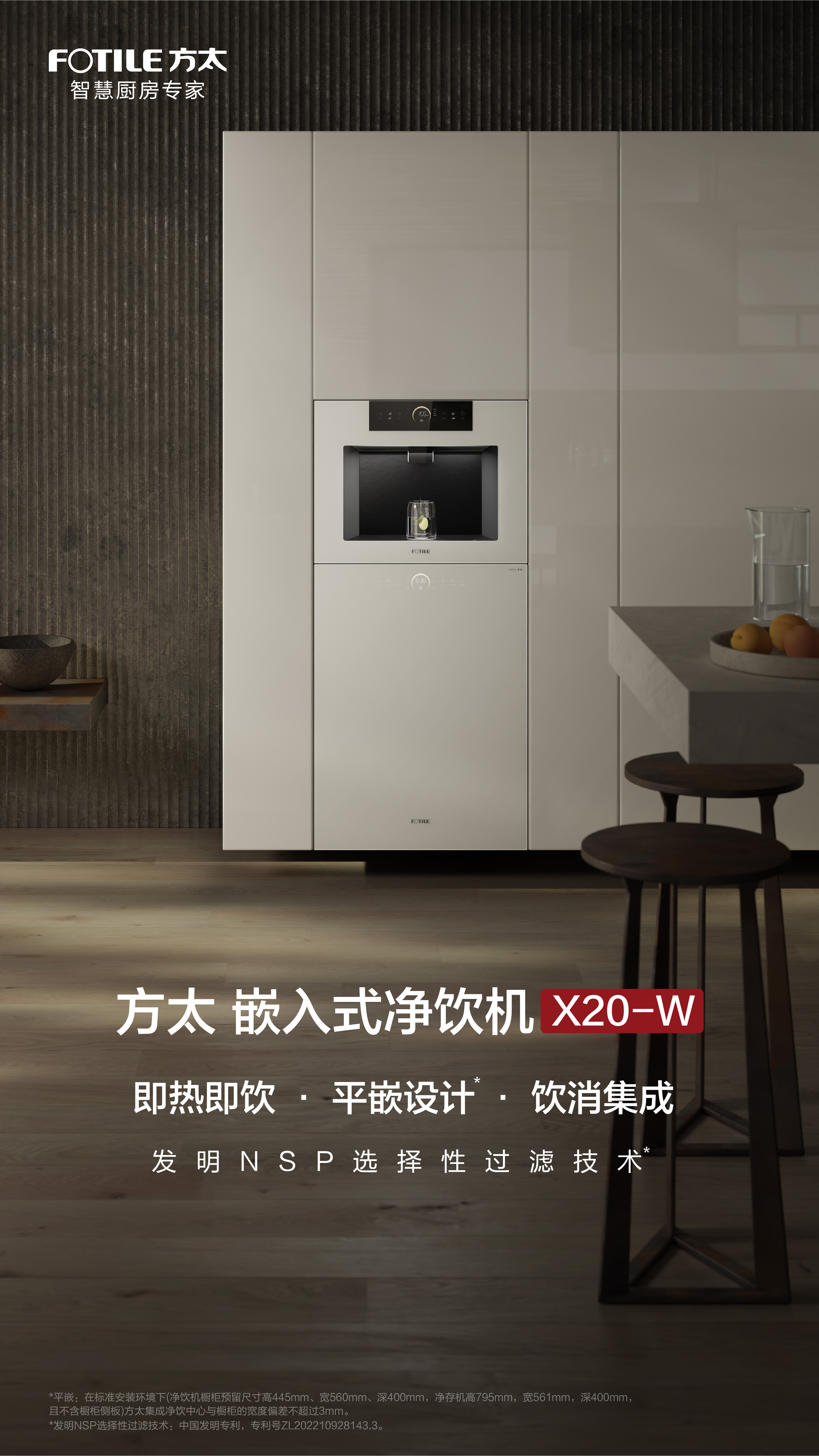 平嵌:在标准安装环境下(净饮机橱柜预留高450mmX宽600mmX深400mm;净存机落地橱柜预留高793mmX宽600mmX深400mm,并在左、右侧板外沿向内20mm处设置两块厚18mm的固定板),方太集成净饮中心与橱柜的宽度偏差不超过3mm。 杀菌:经广州海关技术中心国家卫生处理安全及适应性检测重点实验室试验结果表明,在满载的情况下,方太牌食具消毒柜(嵌入式净存机)可对大肠杆菌和骨髓灰质炎病毒进行杀灭。 高效滤除重金属:根据浙(省)疾控检字第202400614号检测报告显示,可有效滤除重金属(铅、镉、砷、汞、铬(六价))。 保留有益矿物质:根据中国家用电器研究院EWCjs-24-1357报告,方太净水机可保留矿物质(钙、锂、锶、偏硅酸) 95度:在实验室测试条件下,加热体内部加热水温最高可达95℃。设定出水温度与实际出水温度可能因管道、海拔或温度等外界因素影响偏差±5℃