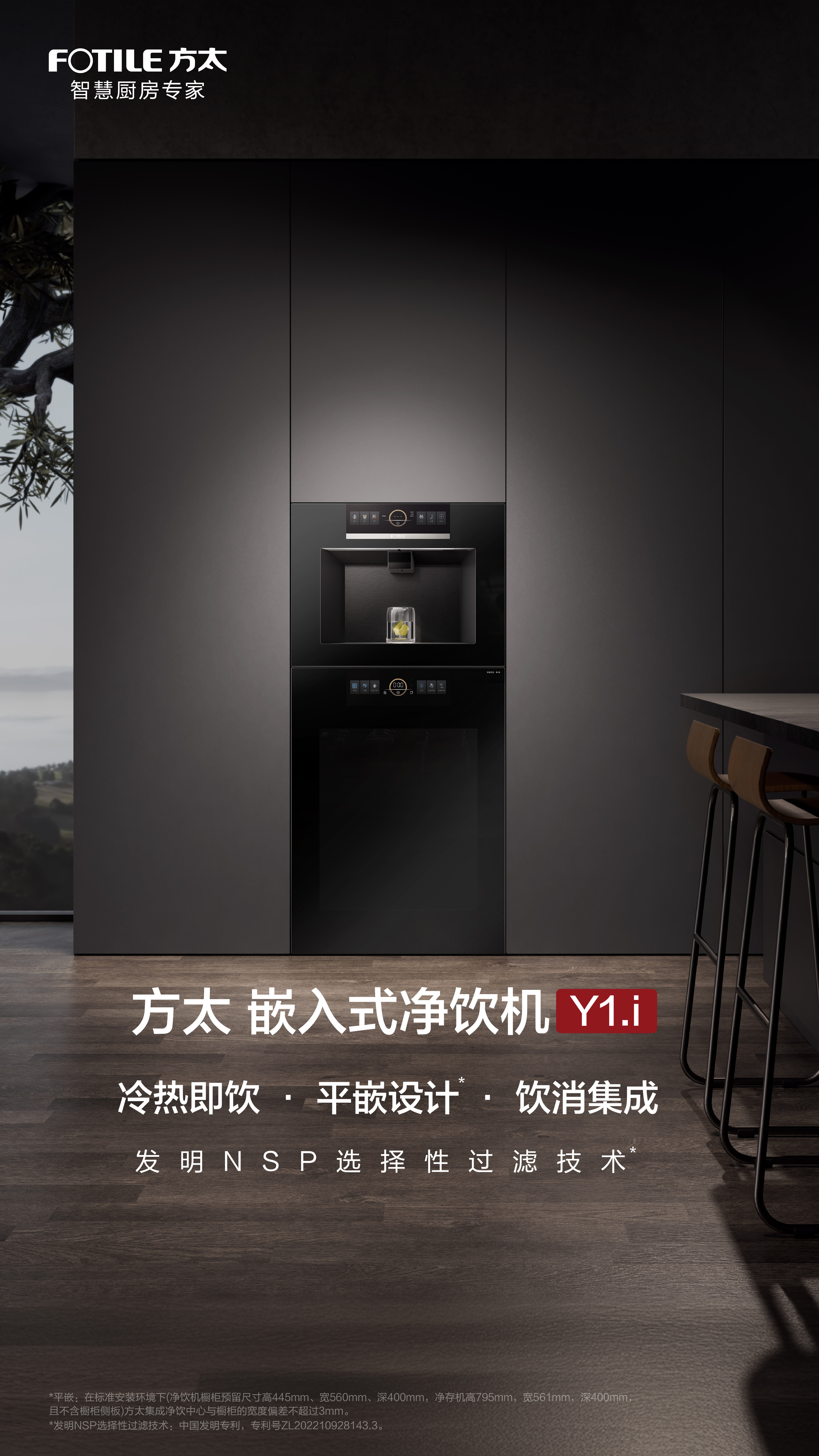 平嵌:在标准安装环境下(净饮机橱柜预留高450mmX宽600mmX深400mm;净存机落地橱柜预留高793mmX宽600mmX深400mm,并在左、右侧板外沿向内20mm处设置两块厚18mm的固定板),方太集成净饮中心与橱柜的宽度偏差不超过3mm。 杀菌:经广州海关技术中心国家卫生处理安全及适应性检测重点实验室试验结果表明,在满载的情况下,方太牌食具消毒柜(嵌入式净存机)可对大肠杆菌和骨髓灰质炎病毒进行杀灭。 高效滤除重金属:根据浙(省)疾控检字第202400613号检测报告显示,可有效滤除重金属(铅、镉、砷、汞、铬(六价))。 保留有益矿物质:根据中国家用电器研究院EWCjs-24-1359报告,方太净水机可保留矿物质(钙、锂、锶、偏硅酸) 95度:在实验室测试条件下,加热体内部加热水温最高可达95℃。设定出水温度与实际出水温度可能因管道、海拔或温度等外界因素影响偏差±5℃