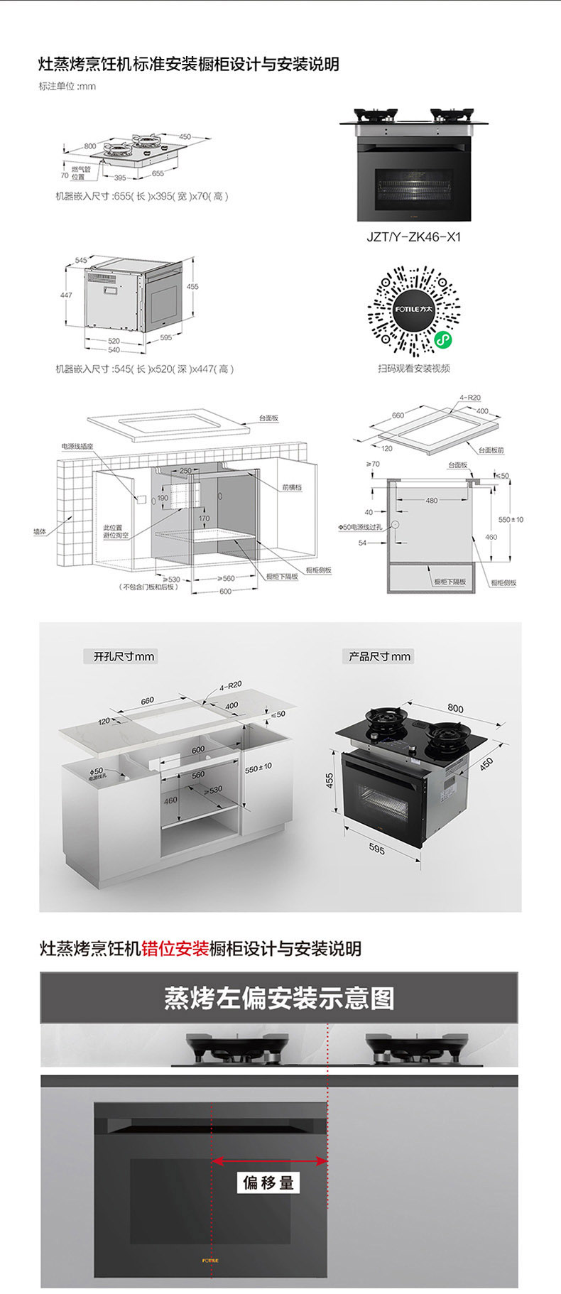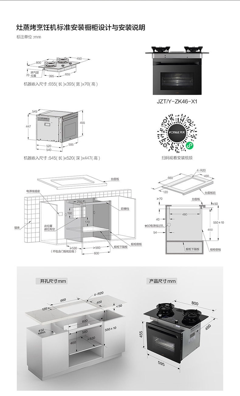 分体:灶具:长(左右)800*宽(前后)450*高(上下)158mm/蒸烤箱:长(左右)595*宽(前后)540*高447(箱体上下)mm(玻璃上沿到机器底部的距离455mm)