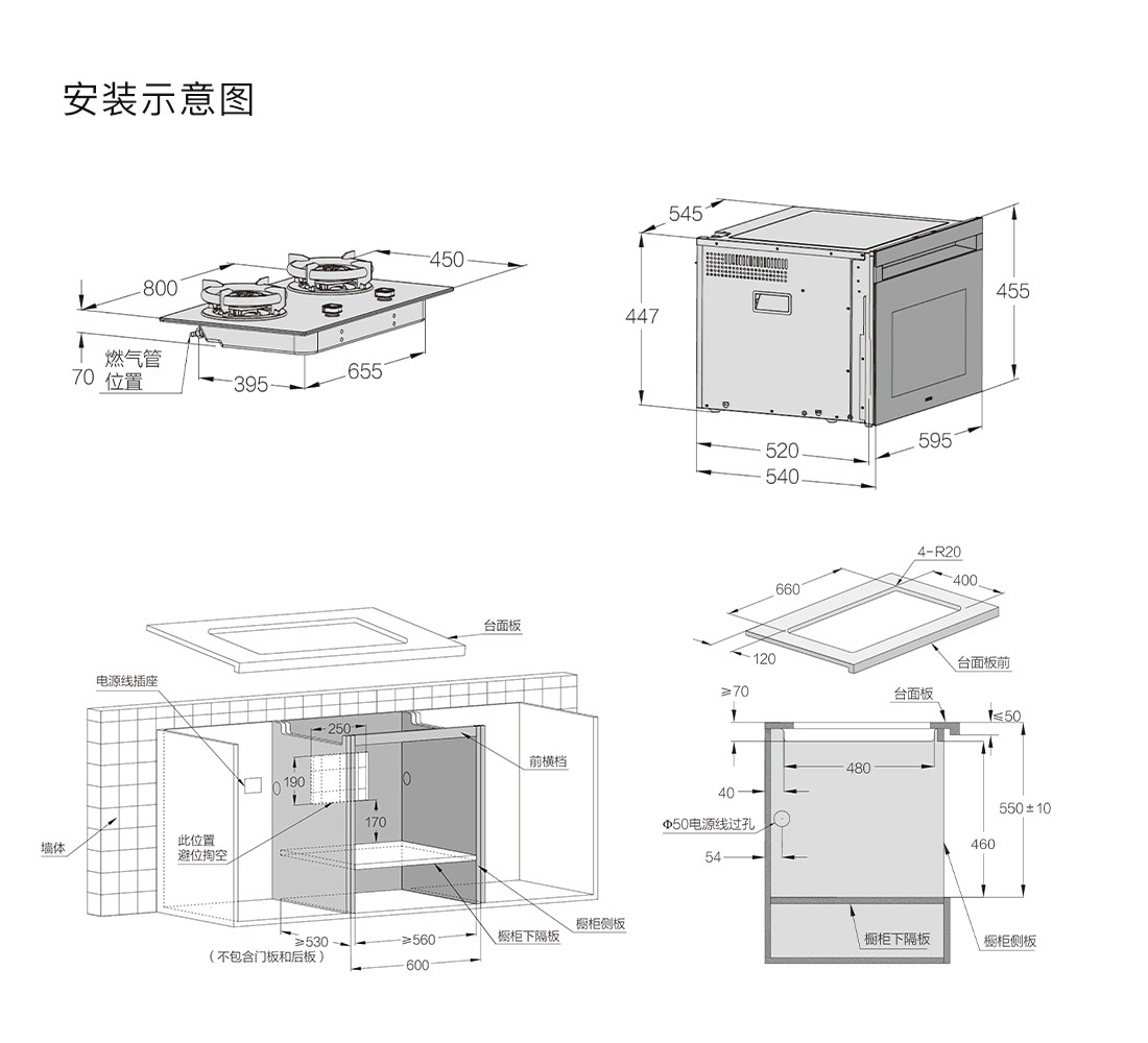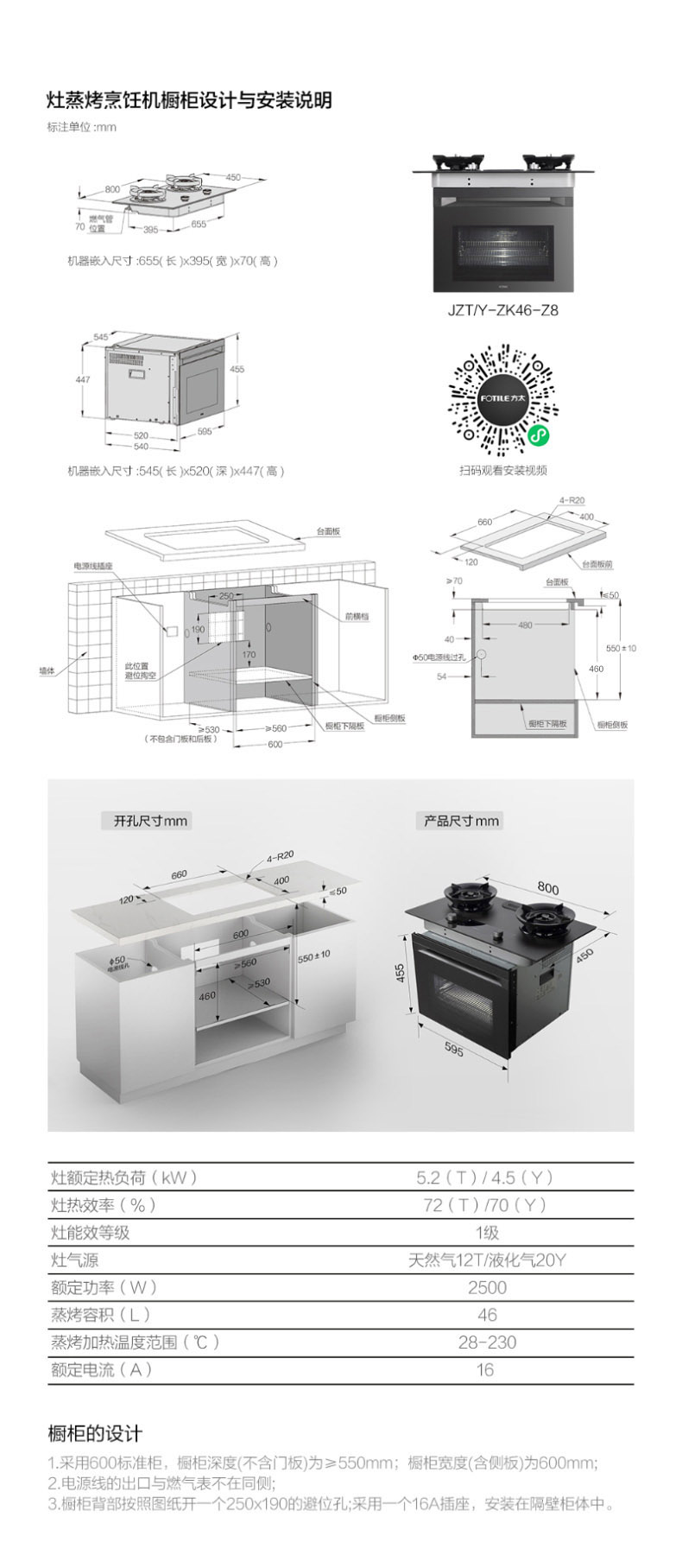 分体:灶具:长(左右)800*宽(前后)450*高(上下)158mm/蒸烤箱:长(左右)595*宽(前后)540*高447(箱体上下)mm(玻璃上沿到机器底部的距离455mm)