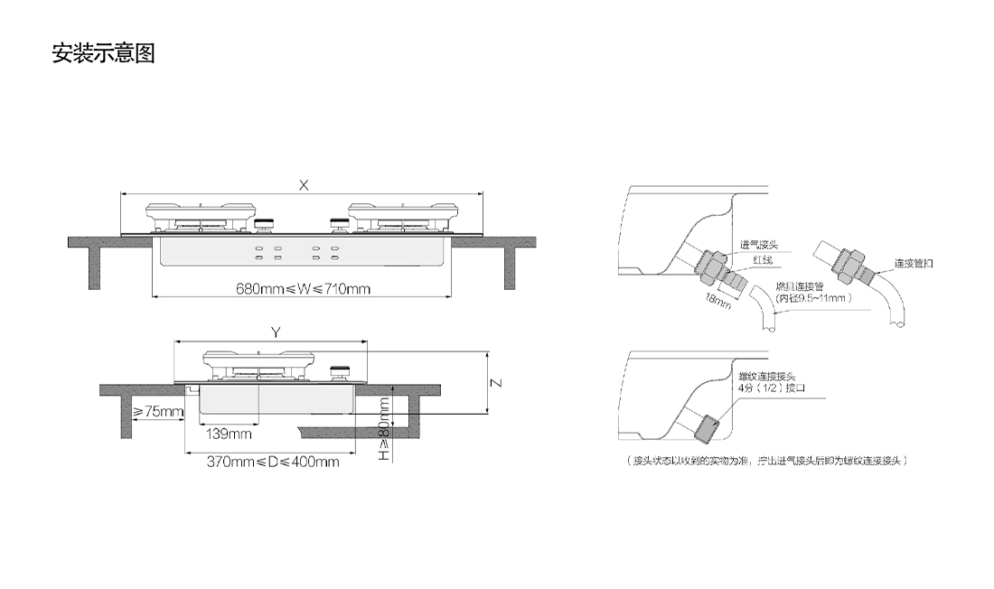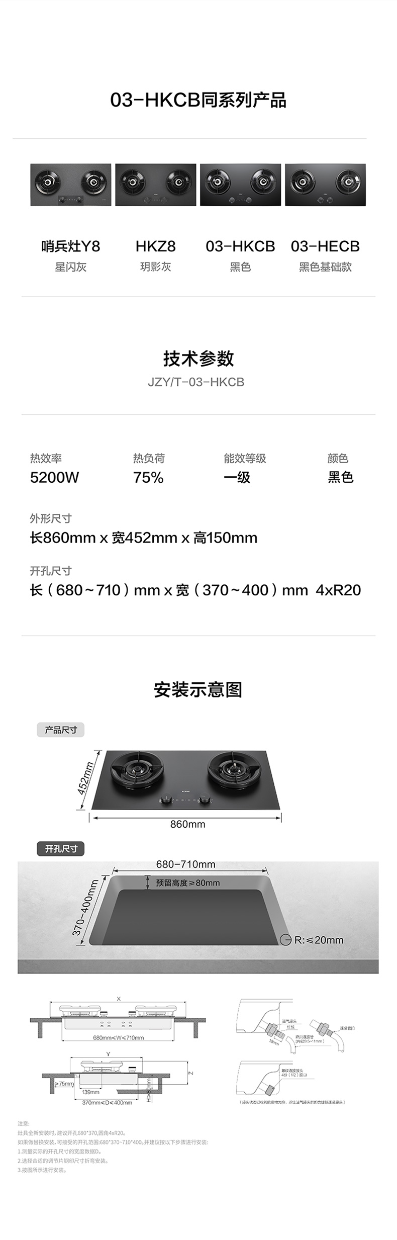 全新安装时,建议开孔长(左右)680*宽(前后)370 R角20;如果做替换安装,可接受的开孔范围:长(左右)(680-710)*宽(前后)(370-400) R角20;具体见说明书安装示意图