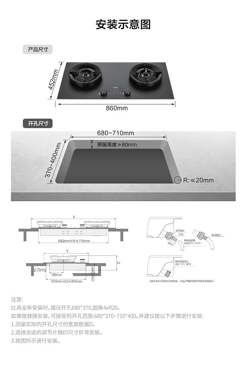 全新安装时,建议开孔长(左右)680*宽(前后)370 R角20;如果做替换安装,可接受的开孔范围:长(左右)(680-710)*宽(前后)(370-400) R角20;具体见说明书安装示意图