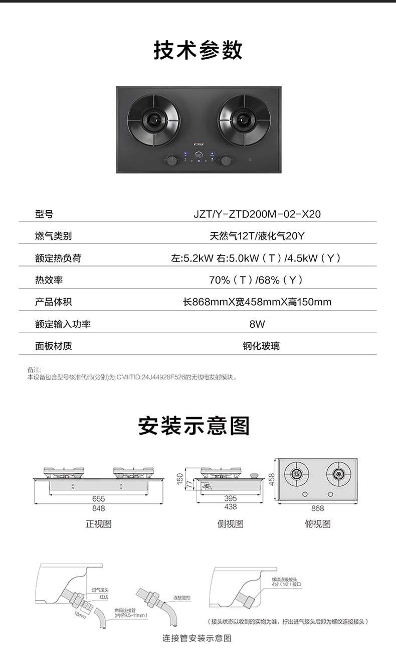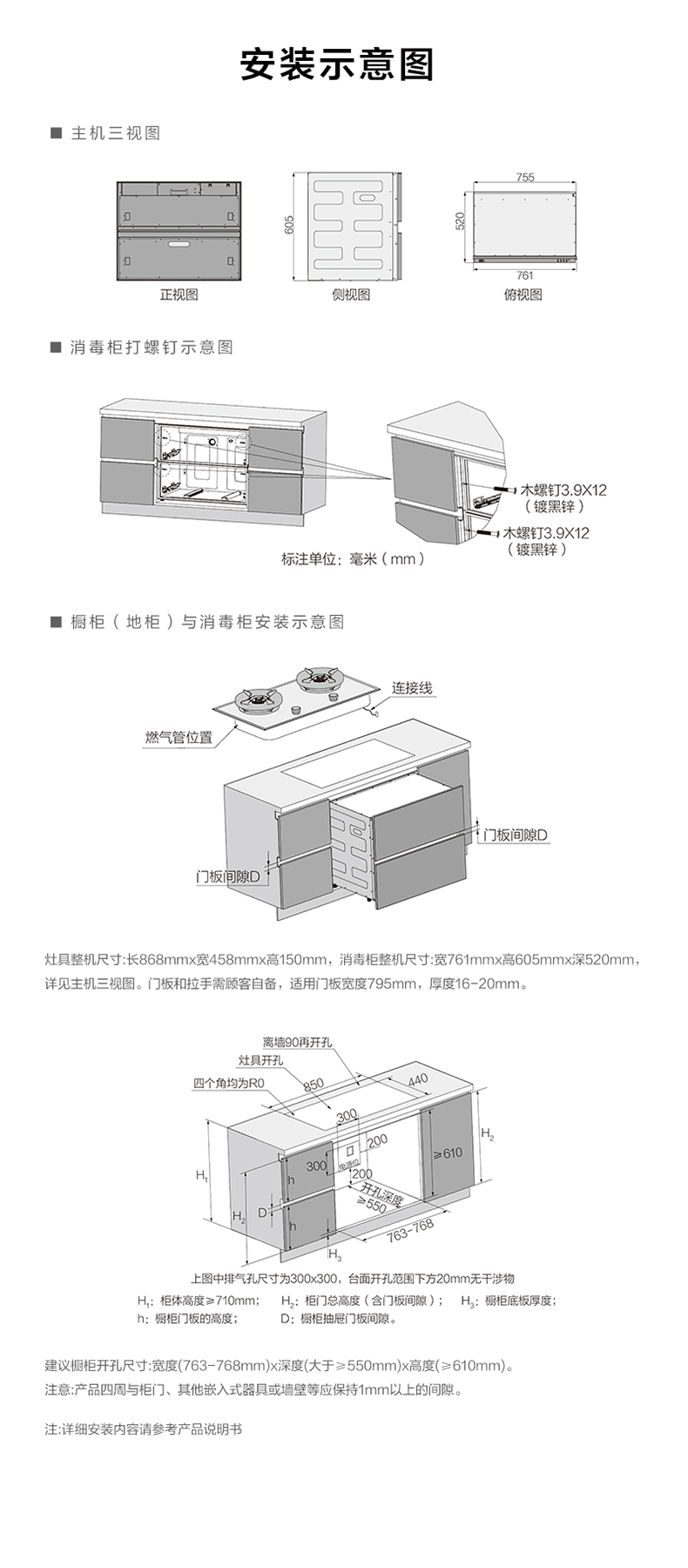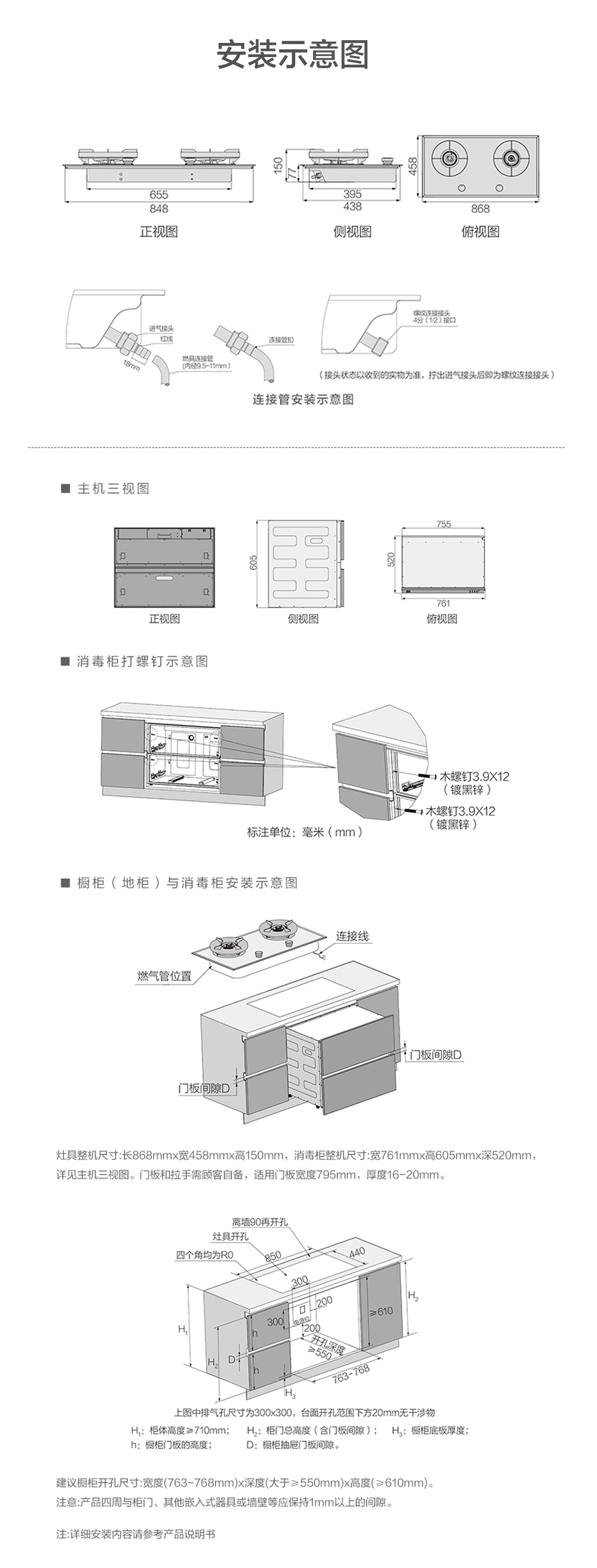 台面开孔:建议开孔长(左右)850*宽(前后)440 R角0(直角);橱柜开孔:长763-768*高≥610mm,深≥550mm;具体见说明书安装示意图