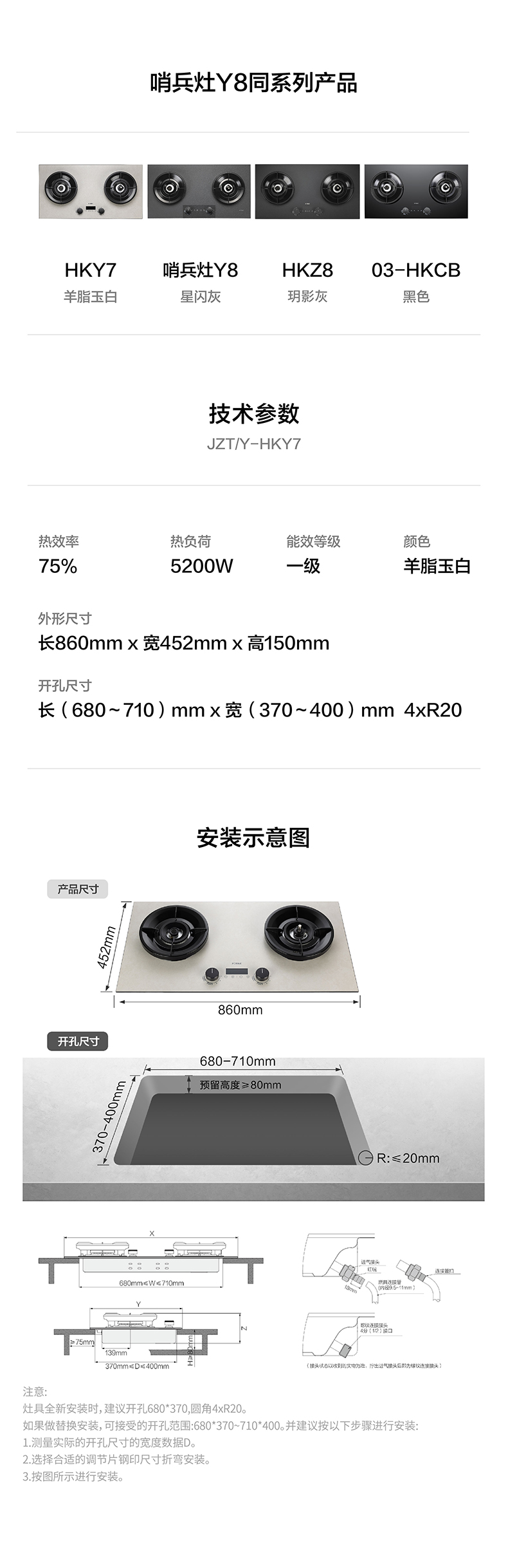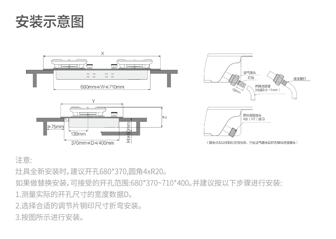 全新安装时,建议开孔长(左右)680*宽(前后)370 R角20;如果做替换安装,可接受的开孔范围:长(左右)(680-710)*宽(前后)(370-400) R角20;具体见说明书安装示意图