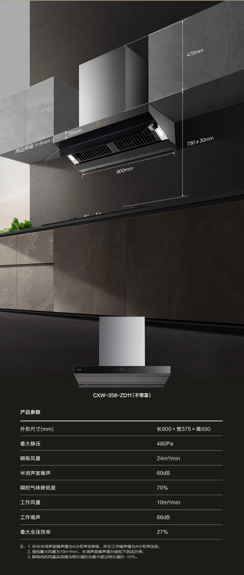 3.瞬吸档的风量实测值与明示值的允差不超过明示值的-10%,对应半消声室测试噪声符合所引用的标准限值要求。