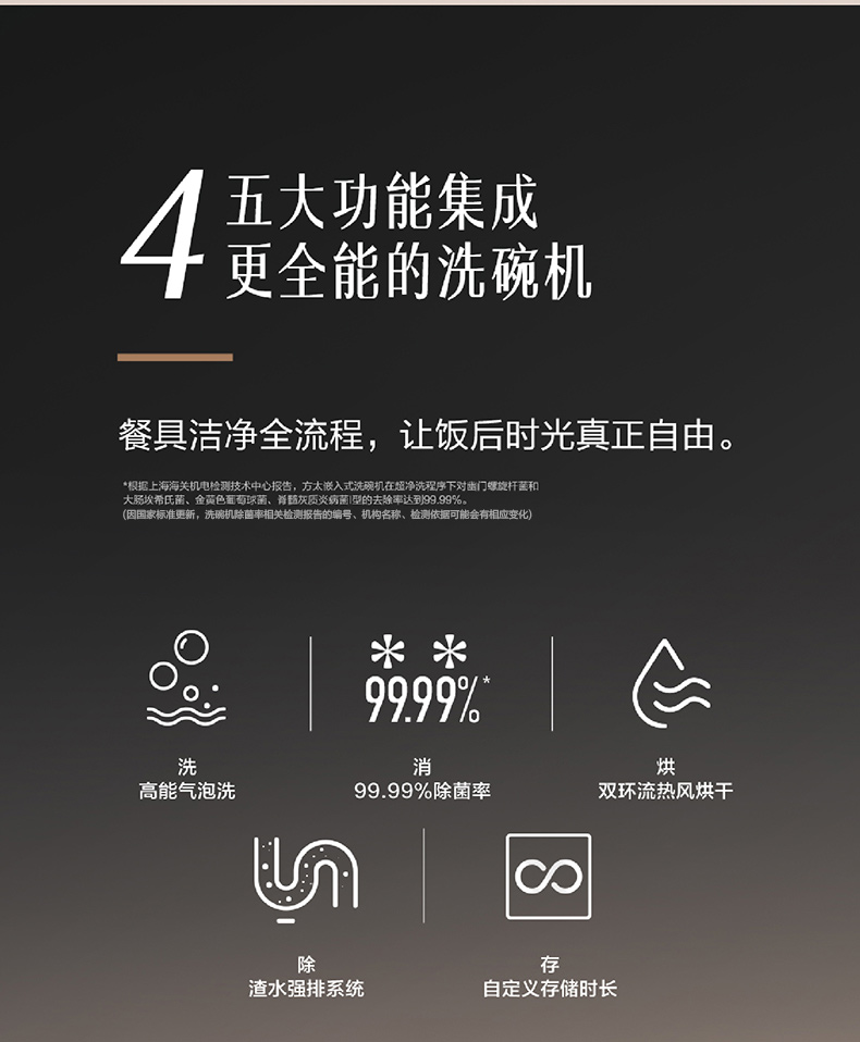 设备端:速净洗、日常洗、超净洗、晶亮洗、智能洗、节能洗、云清洗;方太幸福家APP端:静音洗、自清洁、除菌烘、煲仔锅。