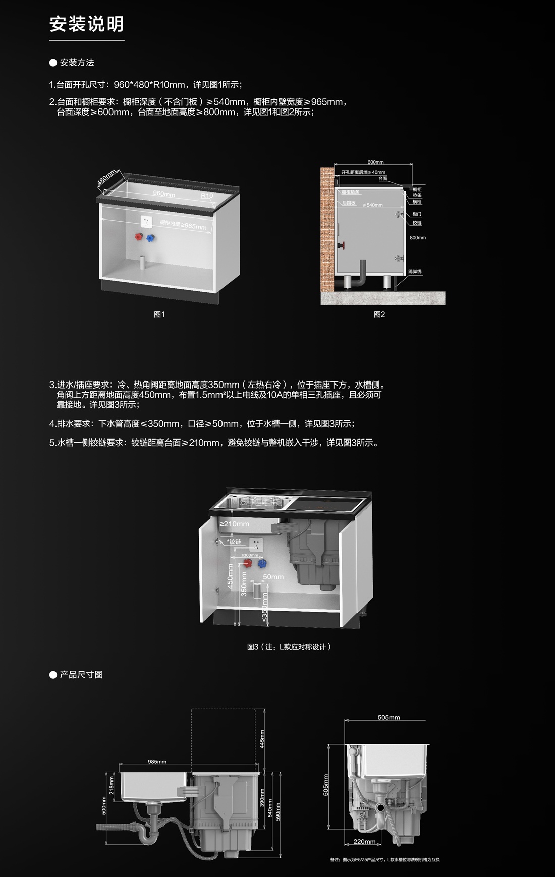 1:应该平稳地安装在操作、保养方便并且牢固的地方,不得倾斜安装。 2:严禁将产品装在可能受潮或者容易被水淋湿的地方。 3:本产品是嵌入在橱柜内的,安装产品的橱柜材料必须耐温耐湿。 4:安装产品时,产品与燃气表、燃气管道应保持30cm以上的距离。